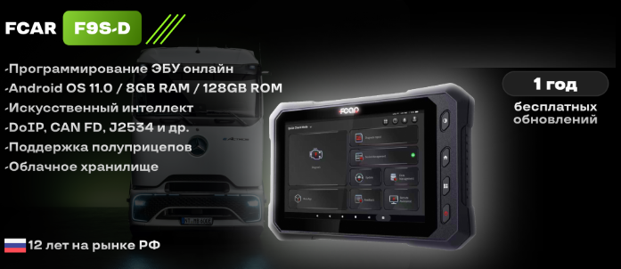 FCAR-F9S-D - мультимарочный сканер нового поколения для диагностики грузовых автомобилей, а также коммерческой, строительной и спецтехники (бензиновый и дизельный двигатели) с бортовым напряжением сети как 12В, так и 24В. Модель является флагманской в линейке FCAR и совмещает функционал профессионального диагностического оборудования с удобством современных технологий.